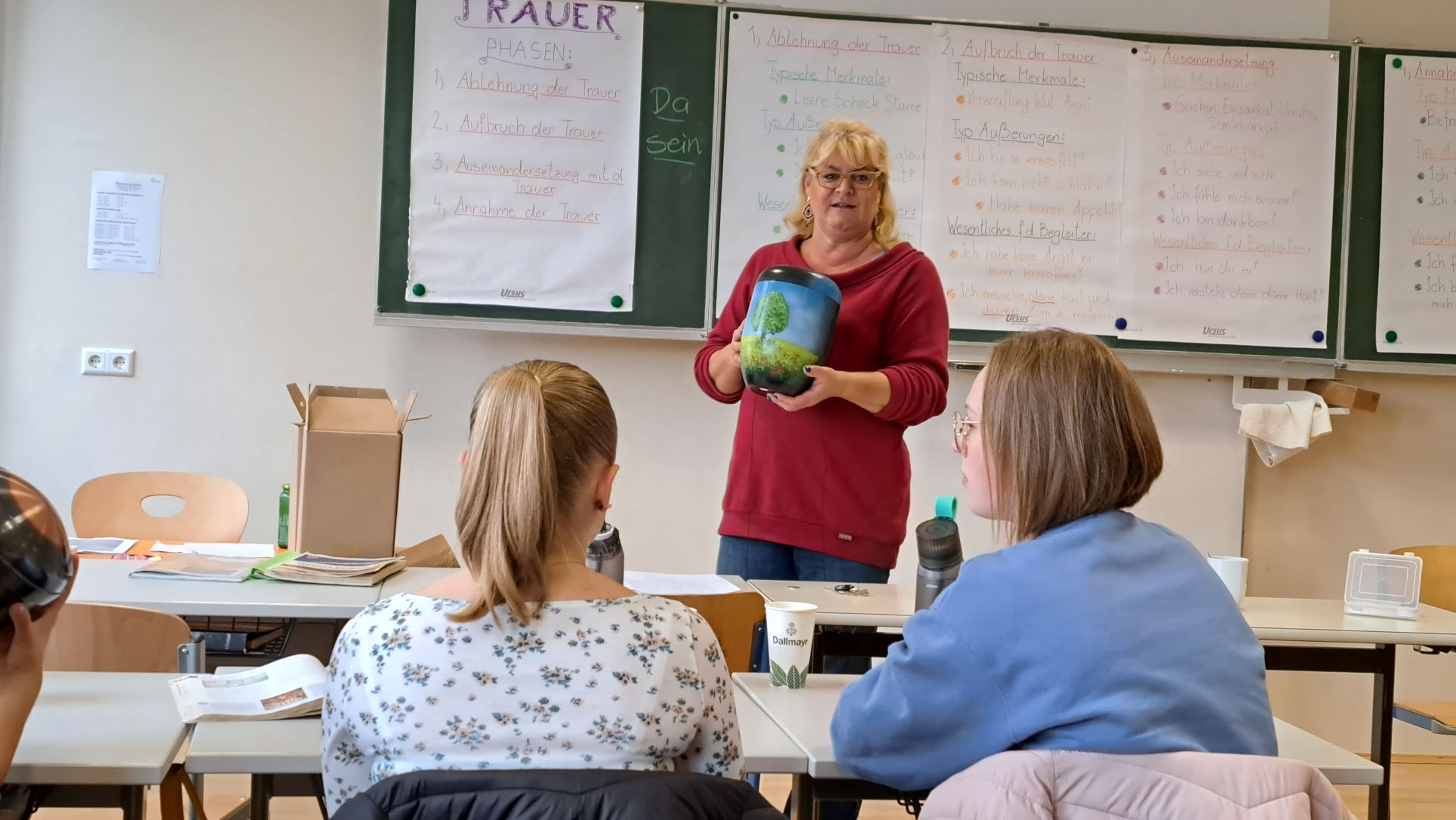Das Thema Tod und Trauer klammern wir gerne aus unserem Leben aus. Und doch trifft es uns immer wieder in unterschiedlicher Form und meistens unverhofft. Es bleibt dann oft keine Zeit mehr sich darauf vorzubereiten. Aus diesem Grund war es besonders wertvoll, dass Frau Andrea Zügner-Lenz die 7c – Klasse drei Schulstunden lang besucht hat. Frau Zügner-Lenz arbeitet bei einer Bestattung, leitet Trauerfeiern und begleitet immer wieder Menschen, die unheilbar krank sind. Mit ihrer einfühlsamen Art hat sie uns Einblicke in ihre Arbeit gegeben und hat den Schülerinnen und Schüler Wissen zum Thema Trauerphasen und Sterbephasen vermittelt. Besonders interessant war es auch, dass sie Urnen mitgebracht hat, die wir betrachten konnten.