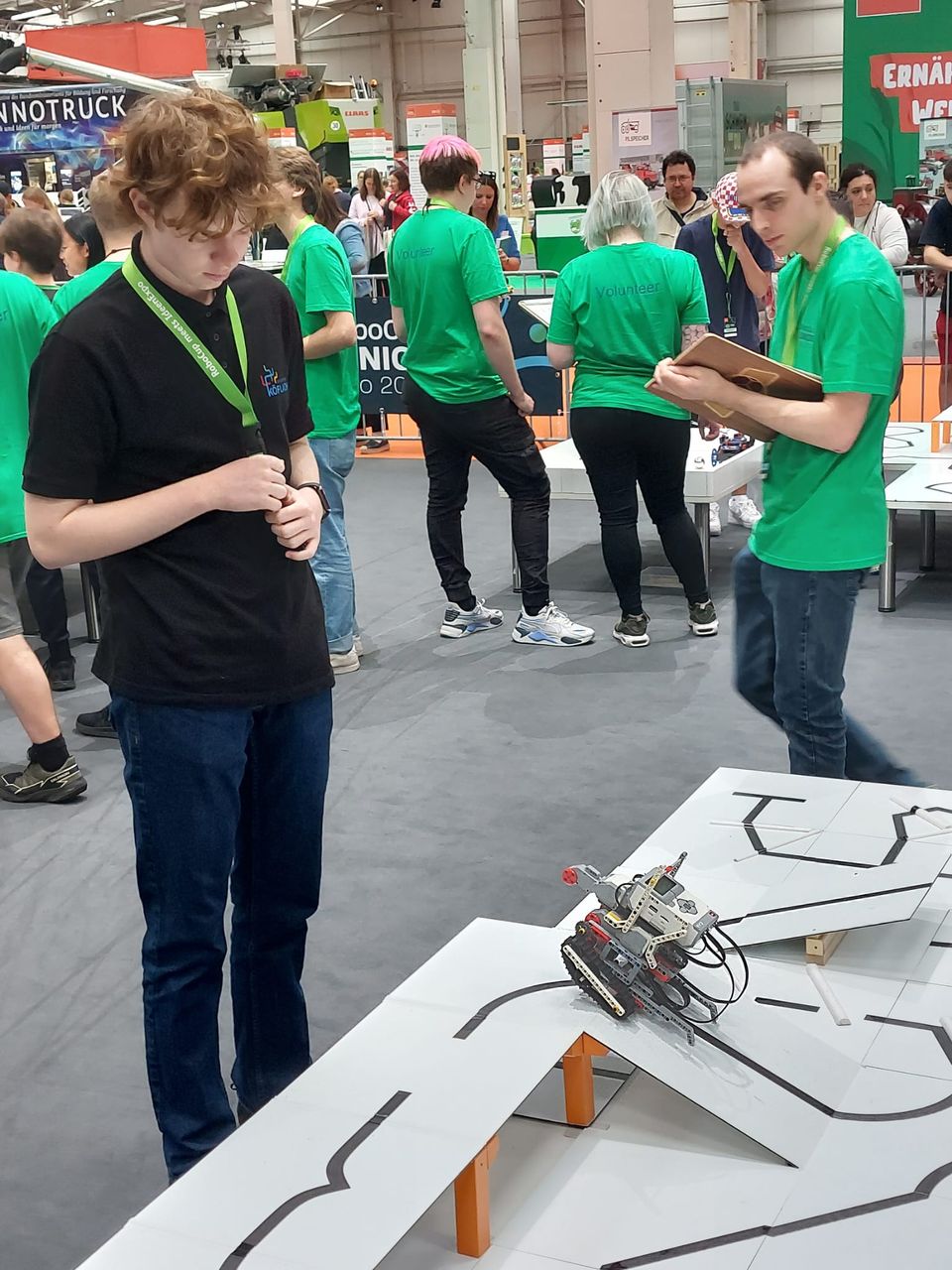 Der 3. Wettkampftag begann unter guten Vorzeichen. Einige bisherige Probleme konnten behoben werden, und die neue Konstruktion des Roboters funktionierte ebenfalls gut. In der ersten Teilstrecke des ersten Laufs des Tages absolvierte der Roboter mit Ausnahme der Rampe die Strecke zufriedenstellend. Leider kam es jedoch zu einem Missverständnis bei der Kommunikation. In der Arena sprach der Teamkapitän das Wort „aus“. Dies sollte eigentlich nur eine Frage an seine Kollegen sein, ob er den Roboter an eine andere Stelle setzen soll. Leider interpretierten die Schiedsrichter dies als Abbruch des Laufs, wodurch wir keine weiteren Punkte erzielen konnten.