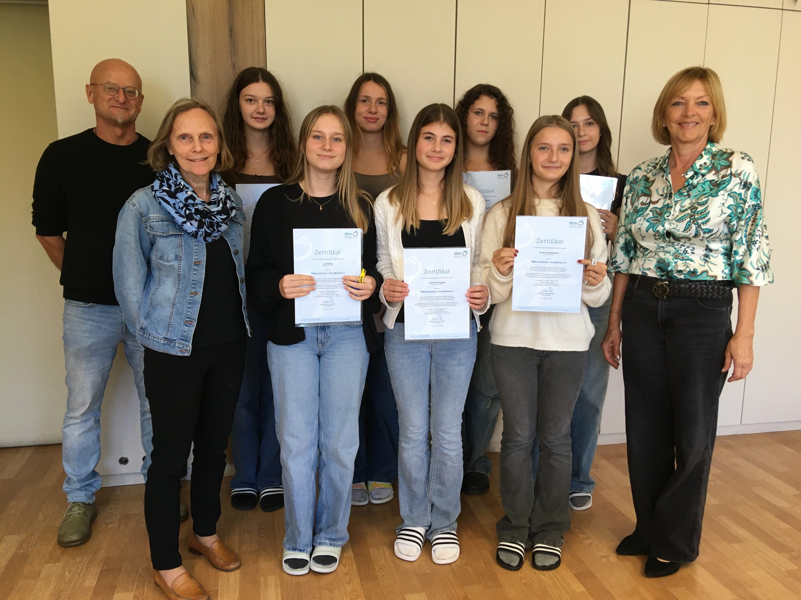 Nach der erfolgreich absolvierten Ausbildung übergab Frau Direktorin Finder die Zertifikate an die „neuen ÖBM-zertifizierten Peer-Mediatorinnen“. Wir gratulieren dazu recht herzlich und wünschen den Schülerinnen viel Erfolg bei ihren zukünftigen Peer-Mediationen.