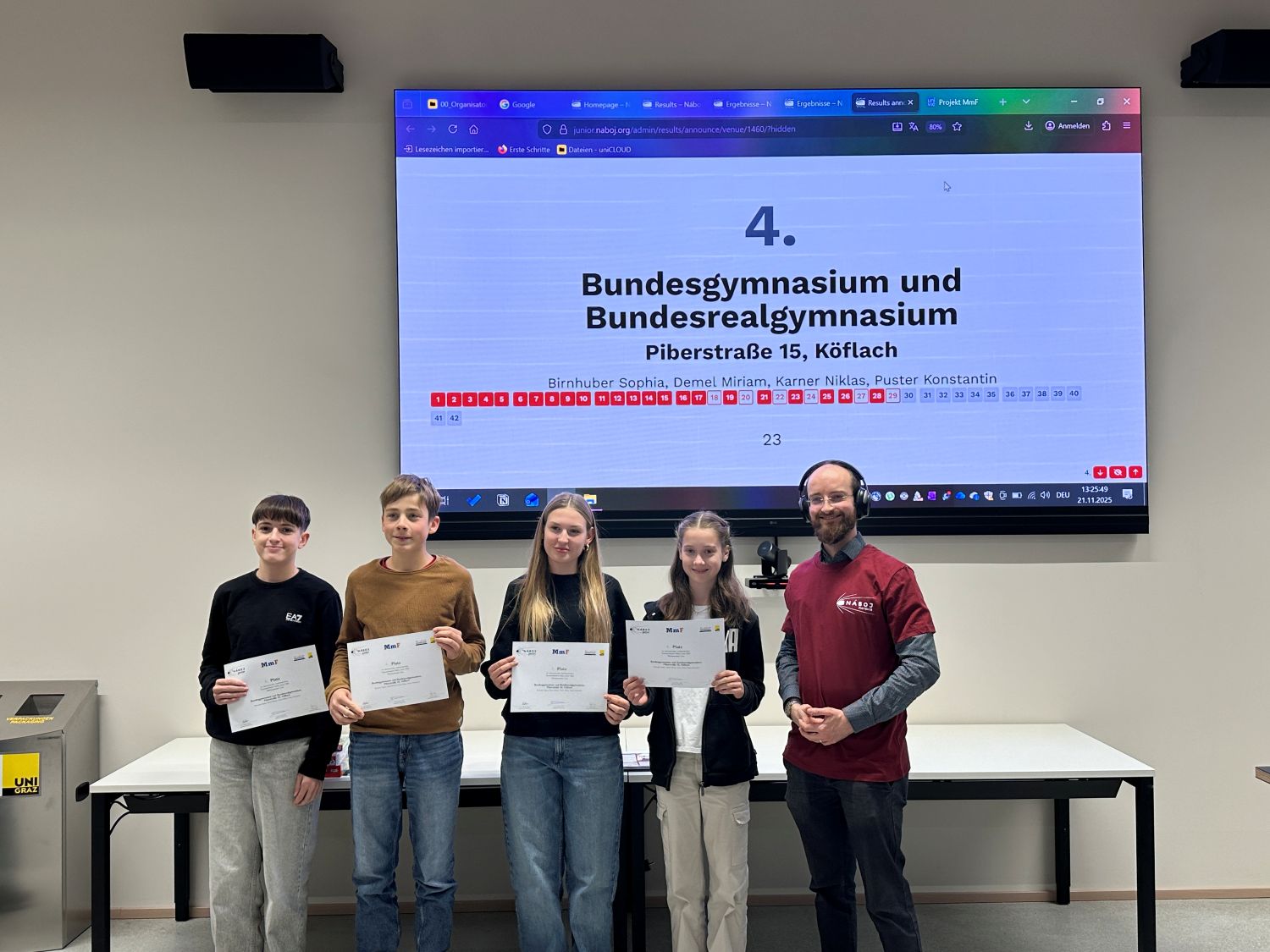 Am 21. November 2025 nahmen 4 Schüler:innen des BG/BRG/BORG Köflach am „Náboj Junior“ teil. Dabei handelt es sich um einen internationalen Mathematikwettbewerb für Teams aus 4 Schüler:innen der 8. und 9. Schulstufe. Teilnehmer:innen aus Belgien, Tschechien, Kroatien, Niederlande, Österreich, Polen und der Slowakei stellten sich zeitgleich dieser Herausforderung. In 120 Minuten versuchten die Teams so viele Aufgaben wie möglich zu lösen.
