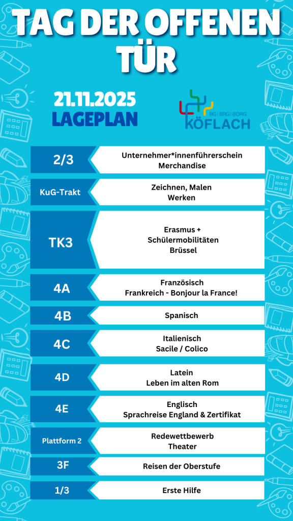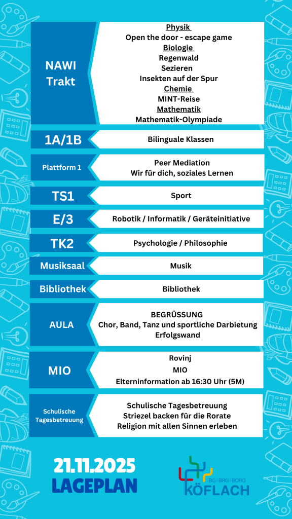 Am 21. November 2025 veranstalten wir an unserer Schule einen Tag der offenen Tür. Diese Veranstaltung richtet sich vor allem an alle Volksschüler*innen der 4. Klasse sowie an alle Schüler*innen der 3. und 4. Klassen AHS/MS.